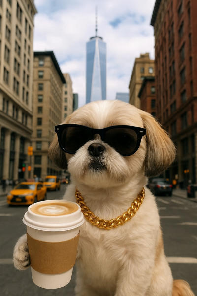 Prompt: Genera una imagen utilizando esta idea de un perro que es su propio jefe. La imagen debe ser de un perro Shitzu, que tenga gafas de sol, esté en un contexto Newyorkino, tenga un cafe latte en la mano, y esté viviendo su vida de boss, con mucho dinero.