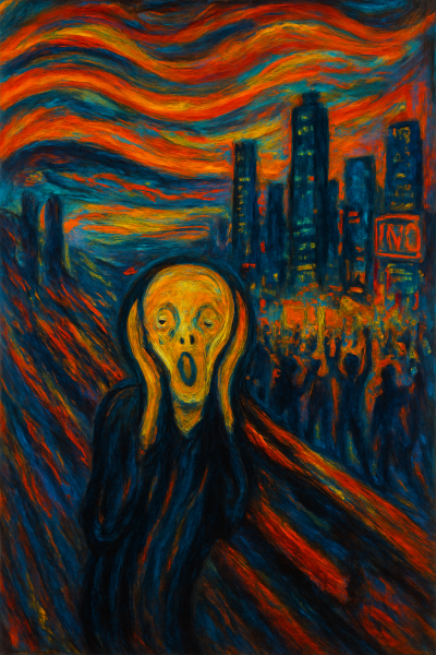 “Crea una pintura nueva con base en la obra “El Grito” de Edvard Munch, con la figura angustiaba icónica sobre un fondo dramático y en remolino. Añade elementos modernos como rascacielos de ciudad, luces de neón y manifestantes en la distancia para simbolizar la ansiedad social y el malestar contemporáneo. Usa colores vivos e intensos con fuertes contrastes y pinceladas expresionistas que evoquen tormento emocional y tensión psicológica. Mezcla estilos surrealistas y expresionistas para crear una atmósfera inquietante pero cautivadora.”