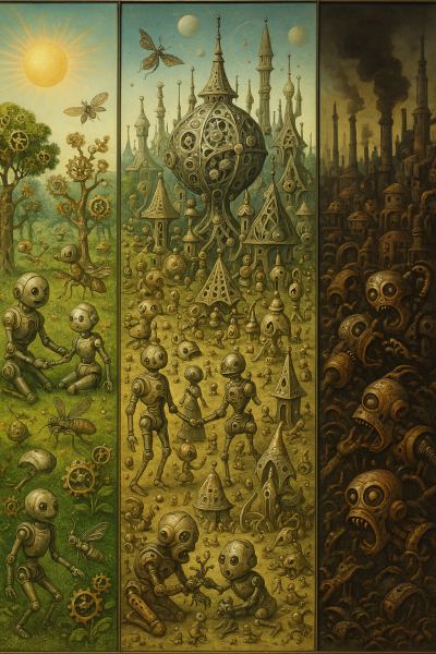 Panel izquierdo (Paraíso): un edén de máquinas vivientes: árboles hechos de engranajes que florecen, autómatas jugando con inocencia, insectos de metal brillando bajo un sol radiante, todo con un aire utópico.