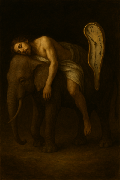 PROMPT: genera directamente una imagen de una obra de arte. La obra debe estar inspirada en una imagen preexistente. También puede estar tener influencias y remezclas de imágenes de noticias, personajes conocidos u otros referentes visuales. Así que, toma inspiración de pinturas de Caravaggio y Dalí.
