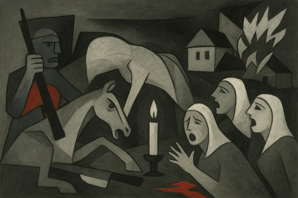 Los elementos esenciales —(l dolor, la fragmentación, el caos)se mantienen, pero mutan para dialogar con nuestra memoria histórica: el conflicto no en ciudades bombardeadas, sino en veredas incendiadas; no aviones lanzando bombas, sino machetes, rifles y casas ardiendo.