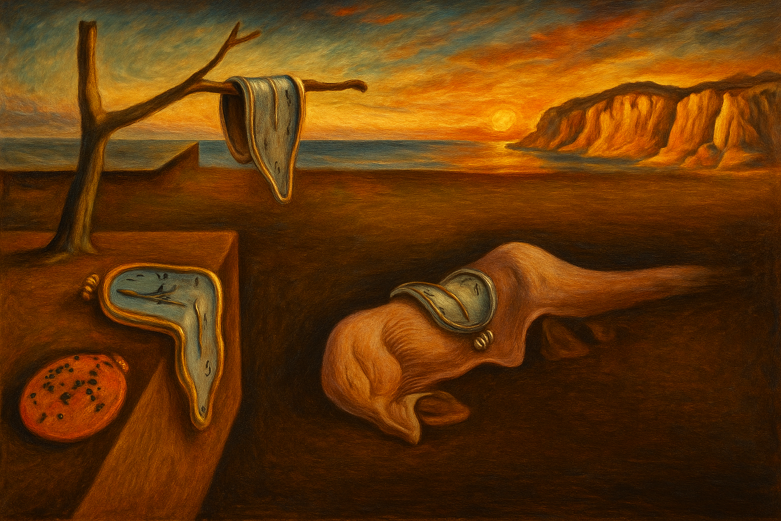 “Genera una obra surrealista inspirada en 'La persistencia de la memoria' de Salvador Dalí, con relojes derretidos colgando de ramas y objetos, un paisaje árido al atardecer con acantilados iluminados por el sol, un mar lejano que refleja tonos naranjas y azules, y un ambiente onírico y misterioso que evoque el paso del tiempo como una materia blanda y distorsionada, con estilo pictórico surrealista detallado y texturas al óleo.”