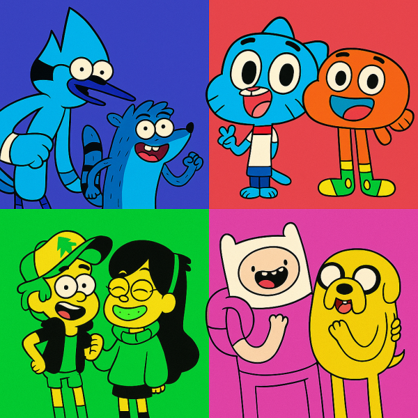 Prompt: “Crea una imagen parecida a la que adjunte. Quita a Marilyn Monroe de todos los cuadros. las remplazaras por: Mordecai y Rigby de “Un show mas” en el cuadrado azul; Gumball y Darwin de “el incredible mundo de Gumball” en el cuadrado rojo; Dipper y Mabel De “Gravity falls” en el cuadrado verde; y a Finn y Jake de “Hora de aventura” en el cuadrado rosado”