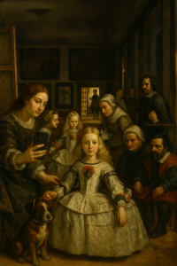 Prompt utilizado: “Reinterpretación moderna de la pintura ‘Las Meninas’ de Diego Velázquez. La escena mantiene la estética barroca, los vestidos de época y la composición original, pero con un toque contemporáneo: algunos personajes aparecen sosteniendo un smartphone y tomando una selfie, mientras Velázquez observa desde un costado. La atmósfera debe conservar la iluminación cálida y el realismo de la obra original, fusionado con este detalle moderno.”