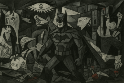 “Recrea una pintura digital inspirada en el Guernica de Picasso, en estilo cubista y surrealista. Incluye figuras humanas fragmentadas, gritos y ruinas en una paleta de grises con acentos rojos. Integra a Batman como un personaje central, distorsionado al estilo cubista, apareciendo en medio del caos como un vigilante oscuro. La composición debe transmitir crítica social, contrastando el símbolo de justicia con la brutalidad de la guerra.”