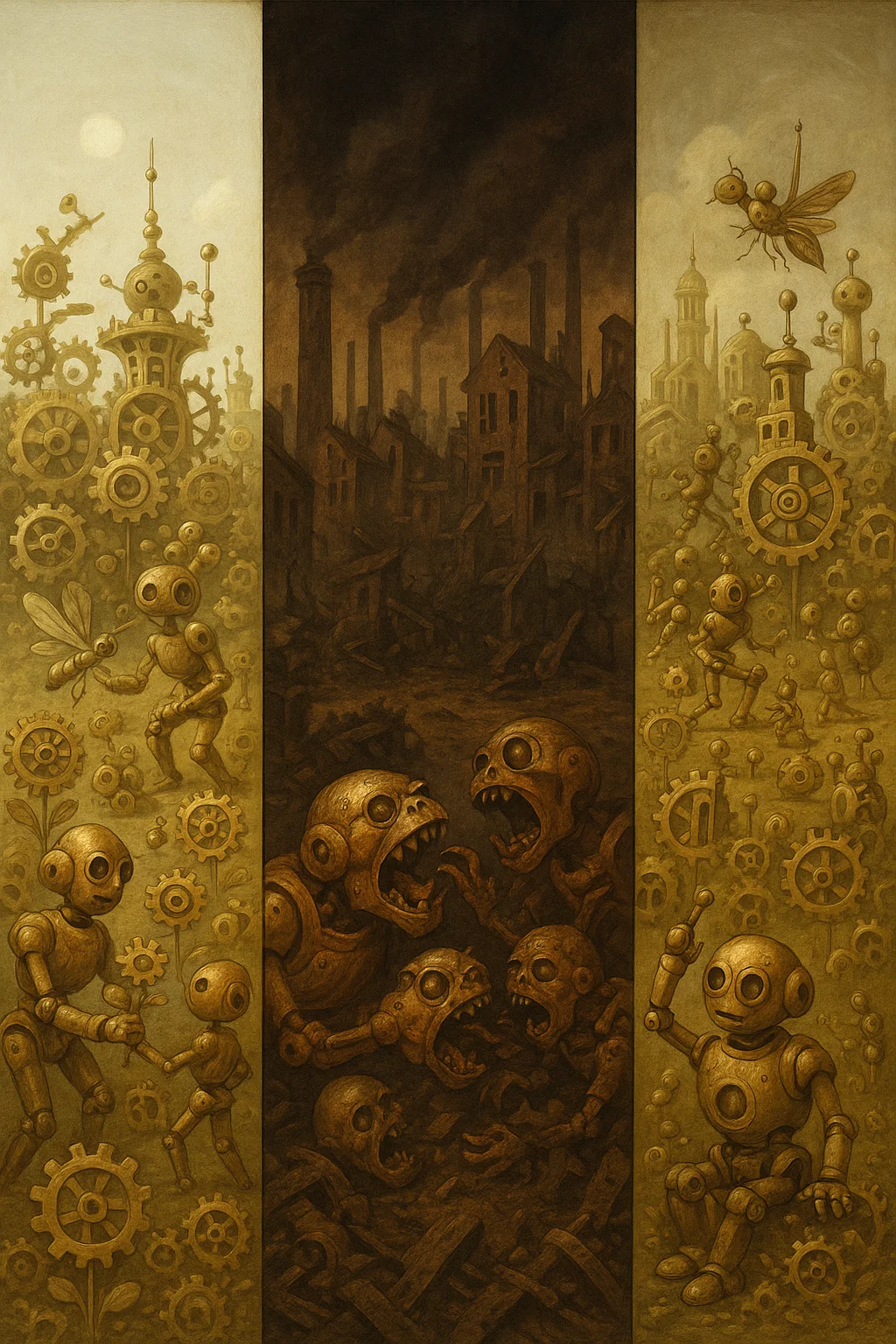 Panel derecho (Infierno): fábricas oxidadas, chimeneas humeantes y robots retorcidos devorándose unos a otros, un mundo sombrío de caos industrial y decadencia metálica. Mantén el estilo visual del tríptico original de Hieronymus Bosch, pero reinterpretado con estética steampunk/futurista, lleno de detalles y contrastes entre la luminosidad del paraíso y la oscuridad del infierno.”
