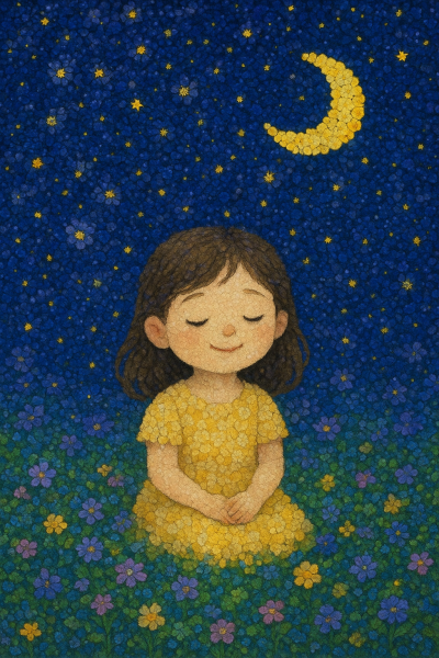 promt Chat, ¿podrías crearme una imagen como el fondo de una noche estrellada, pero que sea hecha por flores, con una niña pequeña, que transmita mucha paz.