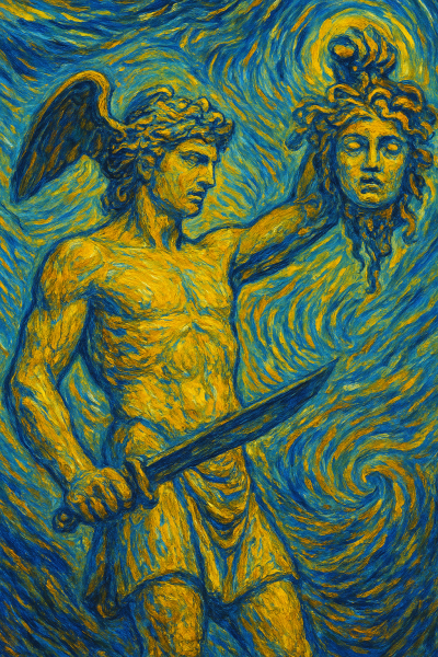 • Imagen base: Fotografía de la escultura Perseo con la cabeza de Medusa de Benvenuto Cellini (1545–1554), ubicada en la Loggia dei Lanzi, Florencia.