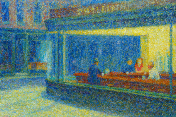 Prompt: Usando “Nighthawks” del artista Edward Hopper, porfavor genera una imágen que sitúe ese misma escena en el estilo impresionista tipo Monet.